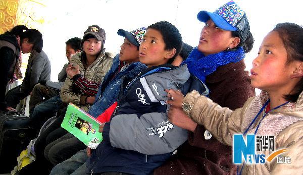 4月26日,玉树县少儿福利院的孩子们在玉树机场查看机场登机信息。当日,青海省玉树县少儿福利院21名孤儿乘坐飞机赴西宁市。他们将开始在那里的学习生活。 新华社记者陈钢摄