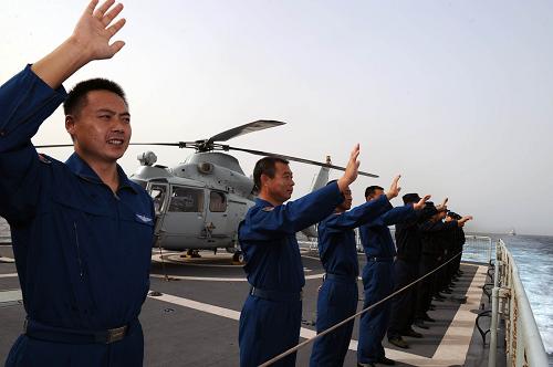 7月18日,在亚丁湾西部海域,中国海军第五批护航编队指挥舰“广州”舰直升机组队员在分航仪式上挥手向战友致意。当日,在圆满完成二次共同护航任务之后,中国海军第五批和第六批护航编队在这里举行分航仪式。 新华社记者 刘春晖 摄