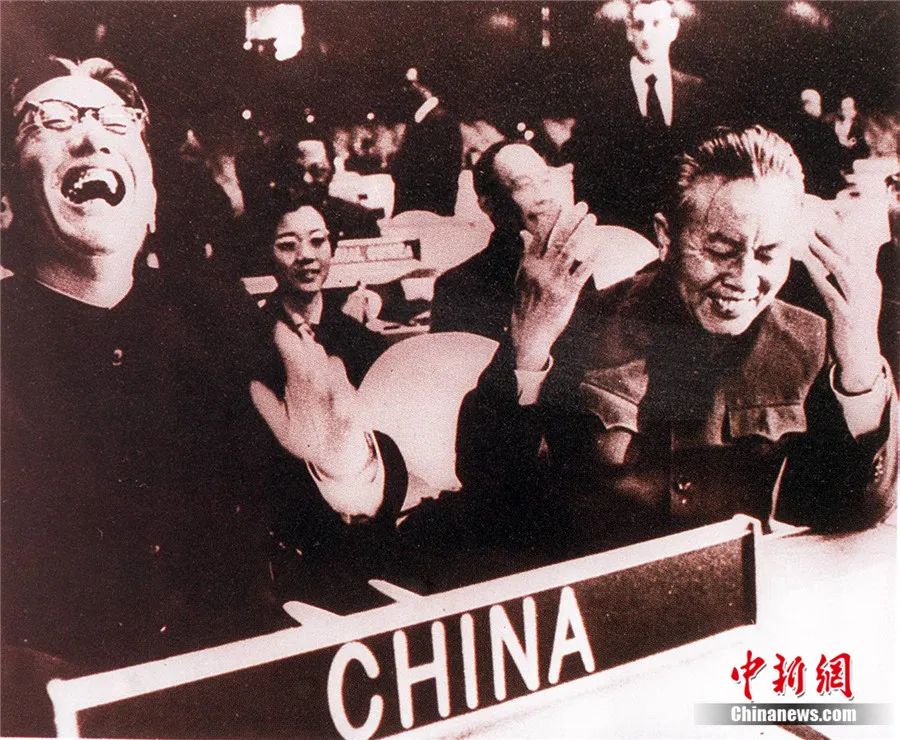 1971年10月25日,联合国大会全体会议高票通过《恢复中华人民共和国在联合国的合法权利》的决议,乔冠华(左)和黄华(右)在联大中国代表席上。中新社发