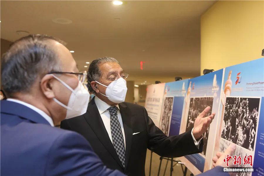 在纪念中华人民共和国恢复联合国合法席位50周年主题展览上,巴基斯坦常驻联合国代表阿克拉姆指着一张第26届联合国大会通过第2758号决议后,代表们热烈鼓掌的照片说,自己当时就在现场。中新社记者 马德林 摄