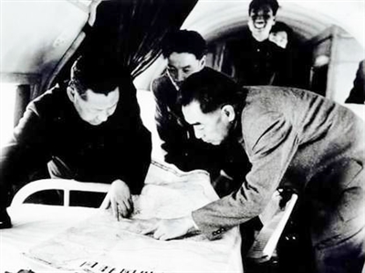 1958年4月,周恩来在河南视察时,在飞机上研究三门峡水库建设情况。