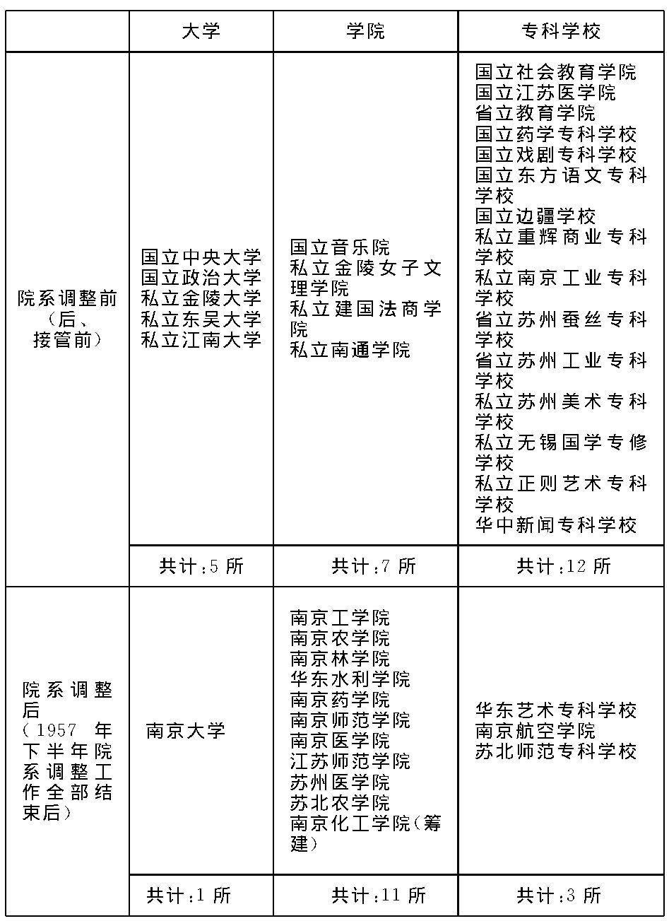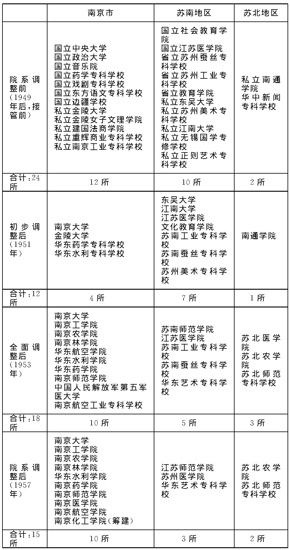 调整前, 江苏地区有大学5所, 实际属于综合大学性质的也是5所, 分别是:国立中央大学、私立金陵大学、私立东吴大学、私立江南大学和私立南通学院。院系调整的重点之一是整顿和加强综合大学。根据调整的原则, 综合大学全国各大行政区至少1所, 最多不超过4所。调整后, 华东区共保留四所综合大学:复旦大学、南京大学、山东大学和厦门大学, 其中江苏省留有1所。