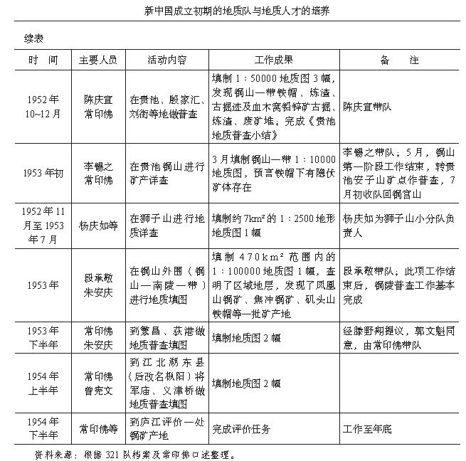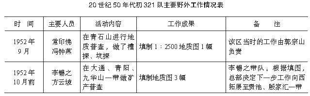 派出的流动小分队由“一老一新”组成,有野外工作经验的老地质队员为负责人,新毕业生则作为助手。据不完全统计,20世纪50年代初,321队在铜陵及其周围地区开展的野外工作(详见下表)。