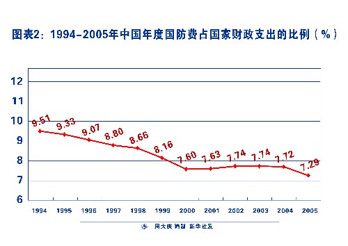图表2:1994-2005年中国年度国防费占国家财政支出的比例(%) 新华社发