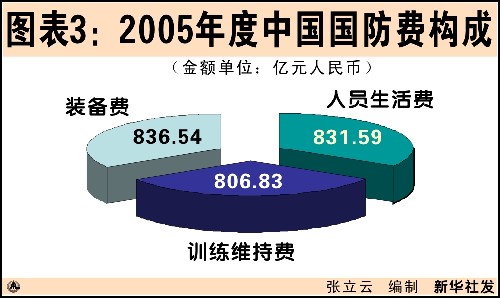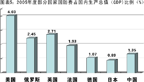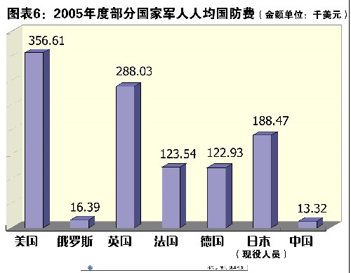 中国国防费总额、军人人均数额,与其他一些国家特别是大国相比仍处于较低水平。2005年,中国年度国防费相当于美国的6.19%、英国的52.95%、法国的71.45%、日本的67.52%。中国国防费军人人均数额为107607元人民币,是美国的3.74%、日本的7.07%。
